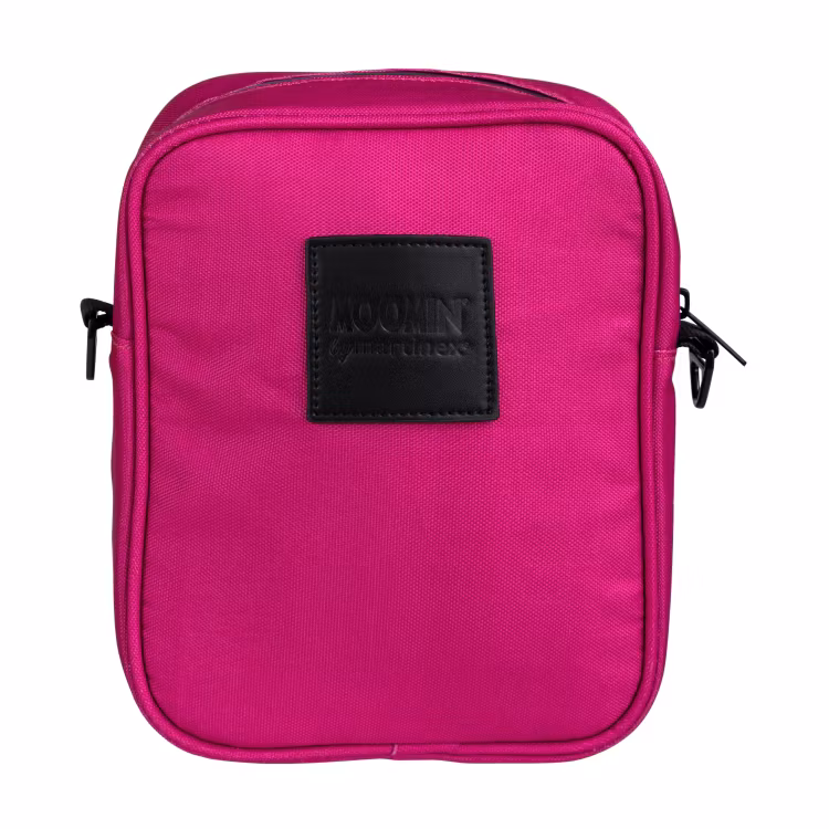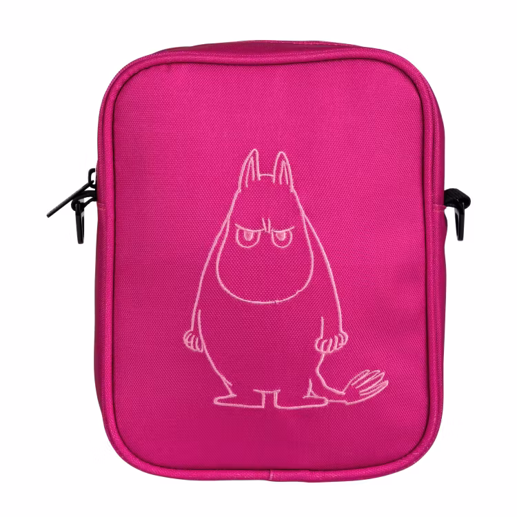 En praktisk Mumin axelremsväska i vattenavvisande polyestercanvas med PFAS-fri impregnering. Väskan har ett vattenresistent blixtlås upptill och en blixtlåsförsedd innerficka. Framtill finns det ett roligt Mumin-broderi. Den justerbara axelremmen (135 cm) är löstagbar och helmönstrad med Moomin-loggan ton-i-ton. Tillverkad i återvunnen polyester.
