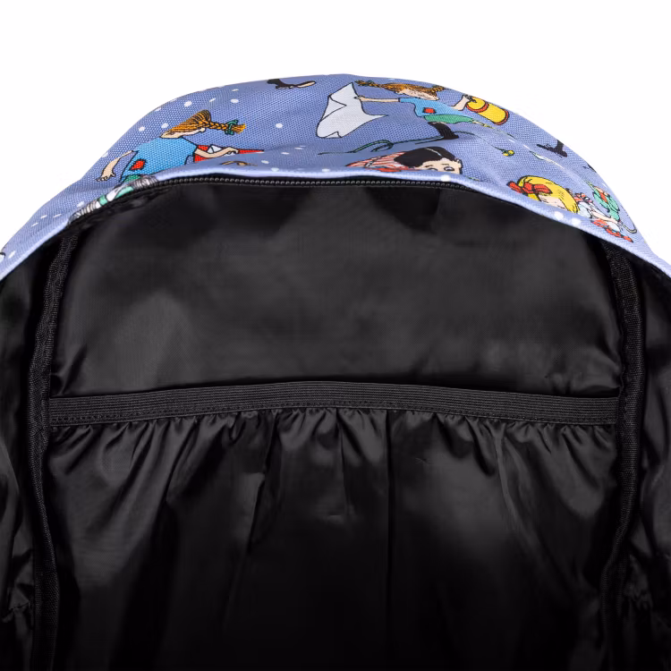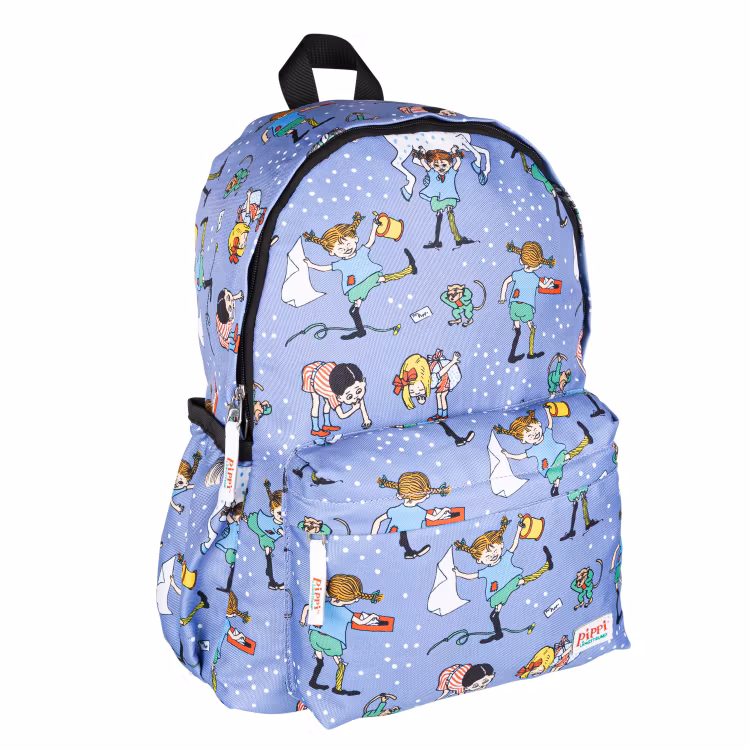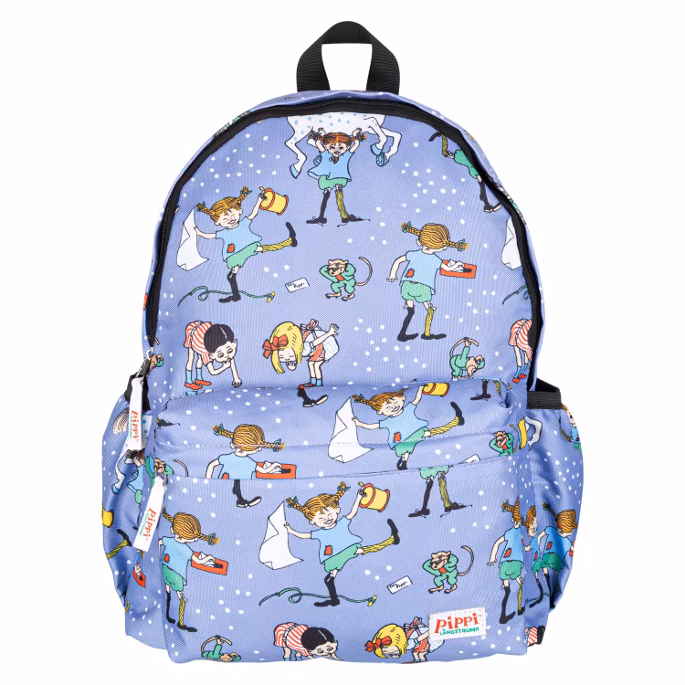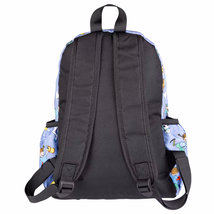 Stadig ryggsäck av slittålig polyestercanvas, helmönstrad med roliga Pippi Långstrump-figurer. Tvåvägsblixtlås, blixtlåsförsedd ytterficka, sidfickor för dricksflaska. Fodrad i svart, ficka med elastisk kant inuti mot ryggen och justerbara vadderade axelremmar, samt ett bärhandtag upptill. Volym cirka 15 liter. Yttvätt.