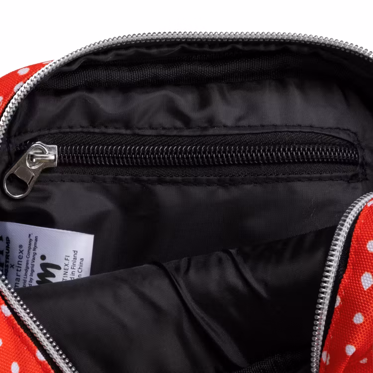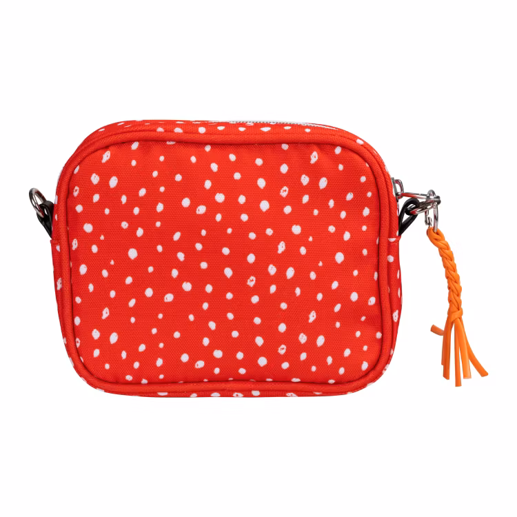 En liten färgglad Pippi Långstrump axelremsväska tillverkad i stadig polyestercanvas. Blixtlås med ett kul, orange flät-hänge, en liten blixtlåsförsedd innerficka och justerbar axelrem, 120 cm lång. Metalldelarna är silverfärgade.