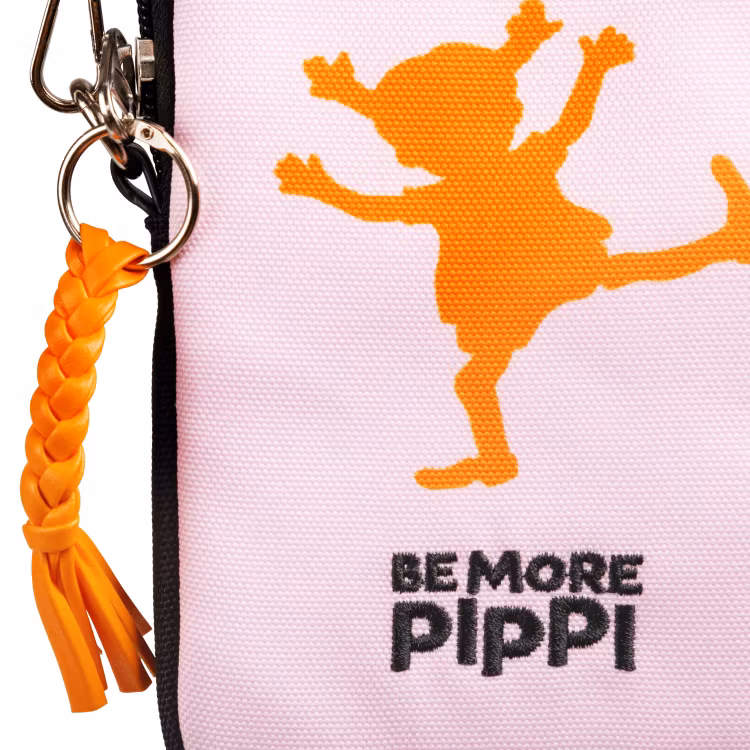 En praktisk Pippi Långstrump telefonväska tillverkad i stadig polyestercanvas. Svart blixtlås med fin, flätad dragtapp och justerbar bomullsaxelrem, 135 cm i svart. Tryckt Pippi-bild och broderad text 'Be more Pippi'. Metalldelarna är silverfärgade.