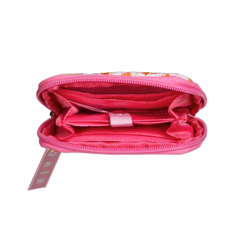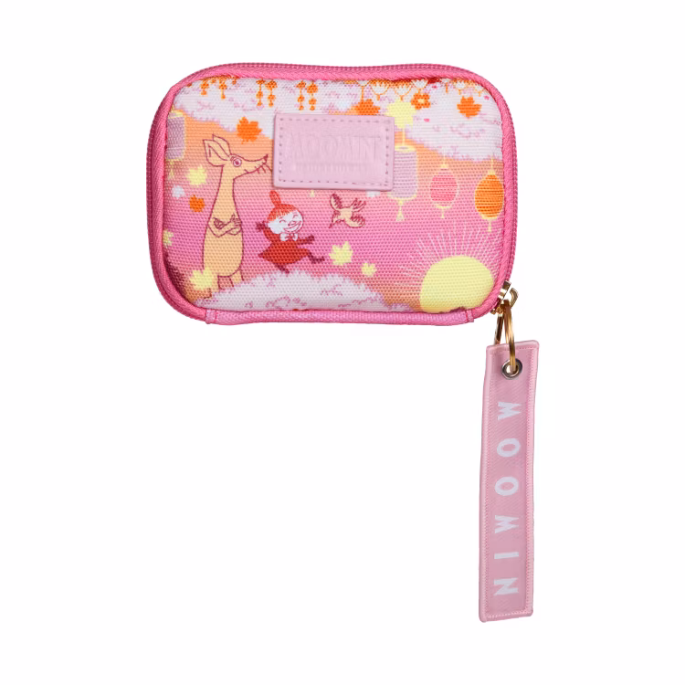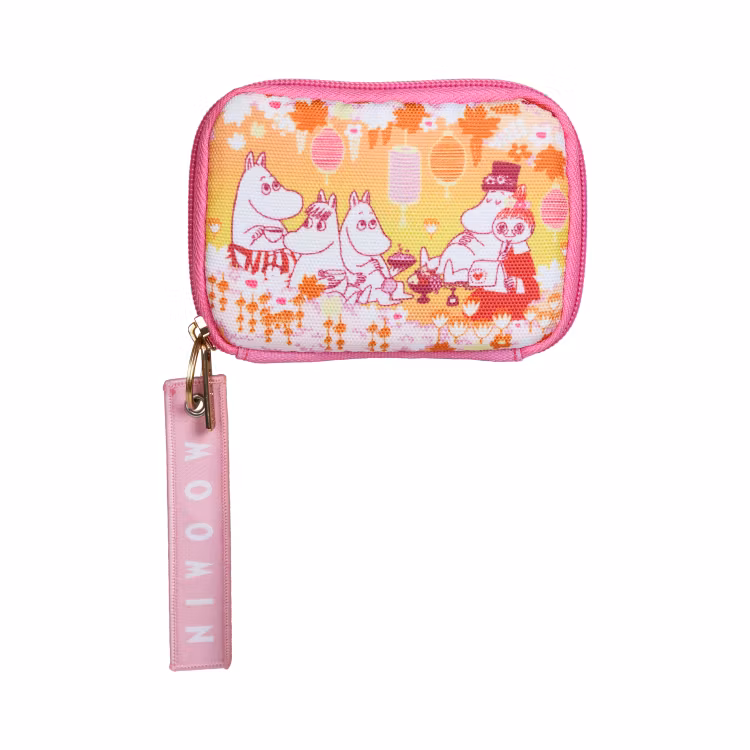 En praktisk Mumin plånbok i stadig polyestercanvas, med långt guldfärgat blixtlås upptill och en Moomin-etikett som även går att använda som nyckelring. Inuti är den utformad med många öppna fickor för kort, sedlar, kvitton och viktiga lappar.