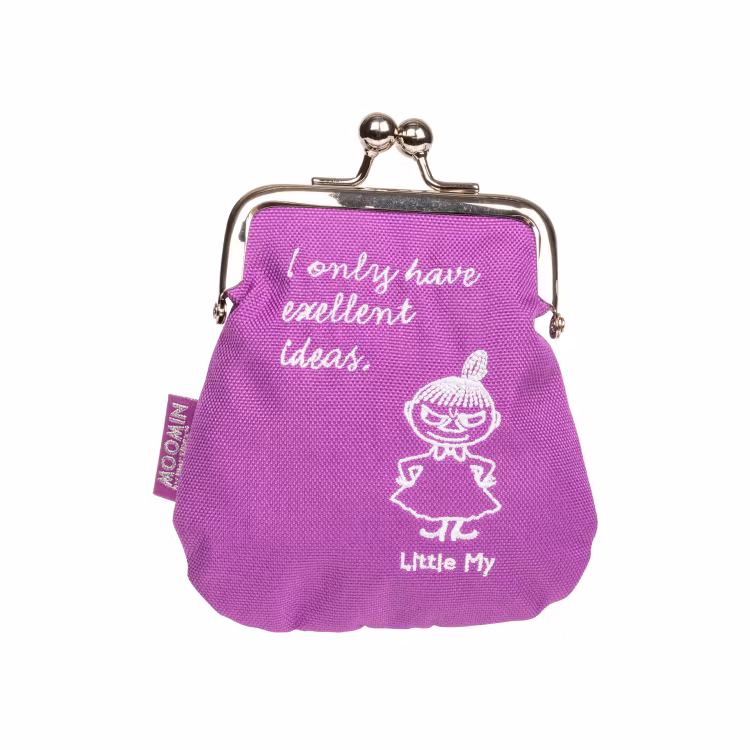 En fin tygbörs i stadig bomullscanvas, med Lilla My bredvid den silverglittrande, kaxiga texten ’I only have excellent ideas’. Insidan är fodrad i svart och upptill finns ett 9 cm brett lås i metall. På den rosa etiketten i sidsömmen står det Moomin by Martinex. Yttvätt.