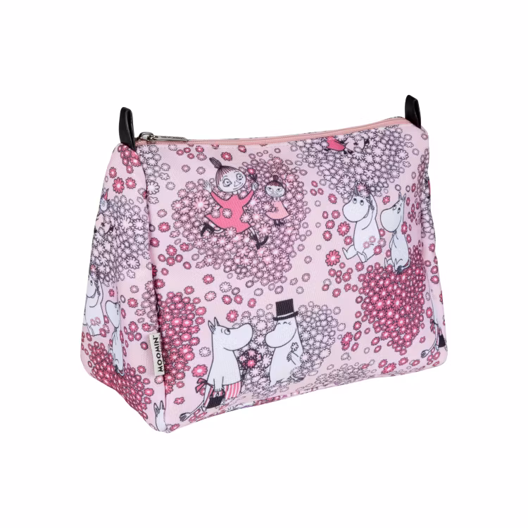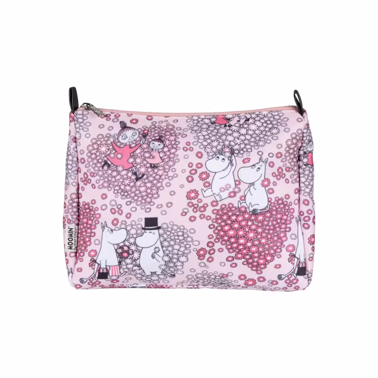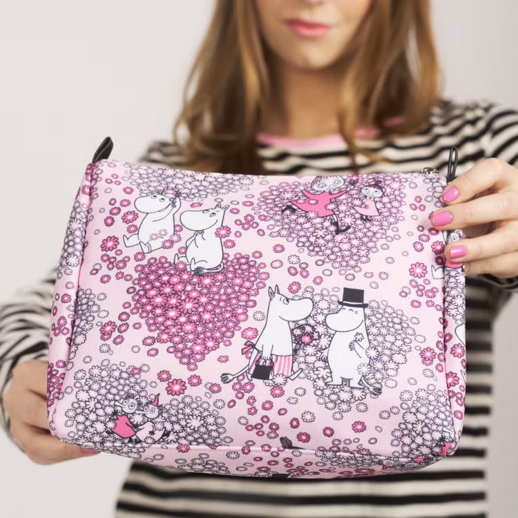 En fin Mumin necessär i stadig polyestercanvas, perfekt även att samla små skatter i. Blixtlås upptill, öppen ficka inuti och guldfärgade metalldetaljer. För att minska tygspill använder vi hela tygbredden, vilket kan medföra att mönsterpassningen på den sålda produkten kan skilja sig något från den fotograferade modellen.