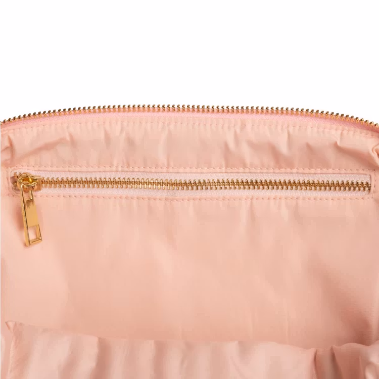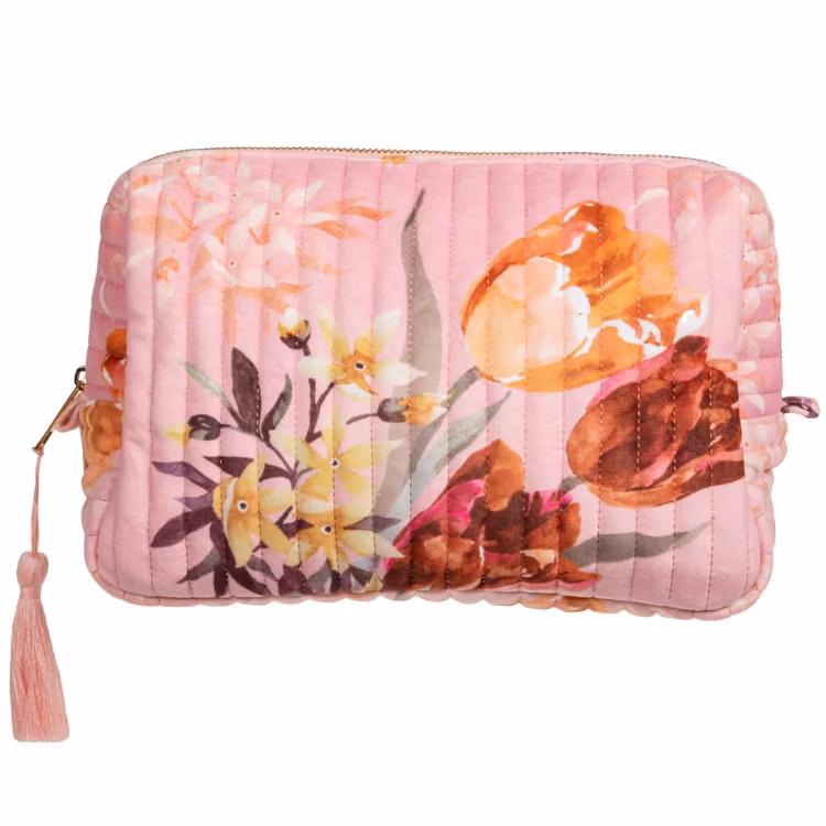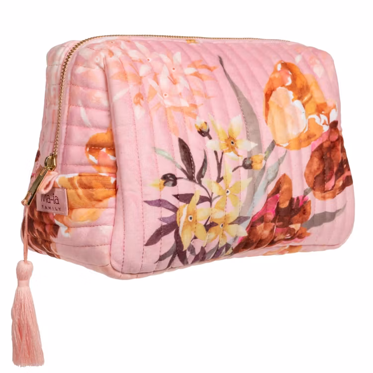 Vackert blomstermönstrad, quiltad necessär med sammetslen yta från Ma-ia Family. Upptill finns det ett guldigt blixtlås med tofsprydd dragtapp och inuti finns en blixtlåsförsedd innerficka. Insidan är fodrad i rosa med stadigt kantade sömmar, vilket ger necessären en fin stadga och finish. Storlek 24 x 16 x 12 cm. Tillverkad i GRS-certifierad återvunnen