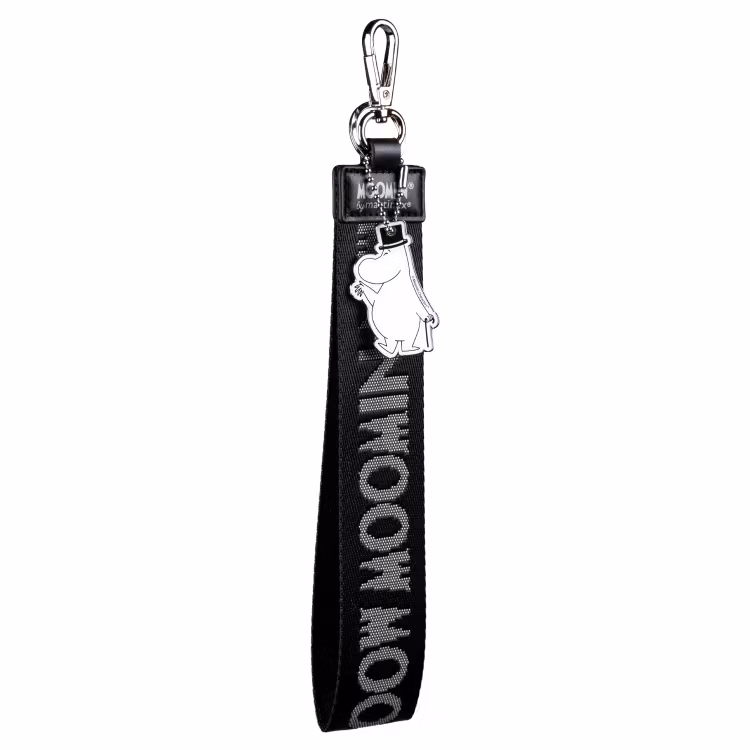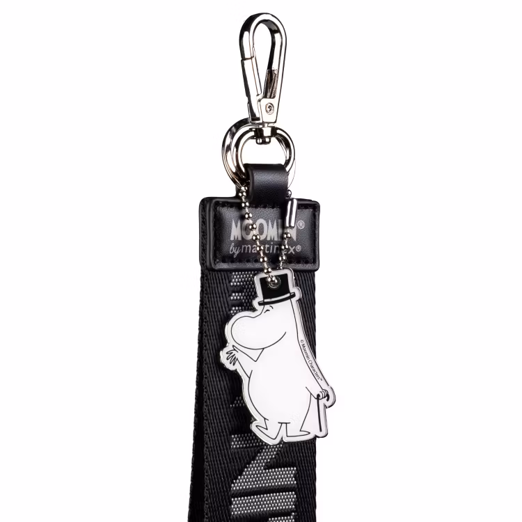 En rolig Mumin nyckelhållare och väskdekoration tillverkad i stadig, svart polyestercanvas. Storleken är 4 x 27 cm och den har ett Muminpappan-hänge i metall, samt rund nyckelring och praktiskt clip-lås. Lätt att haka fast var du vill!