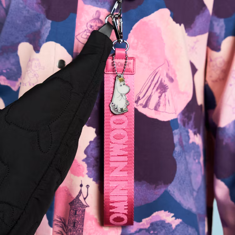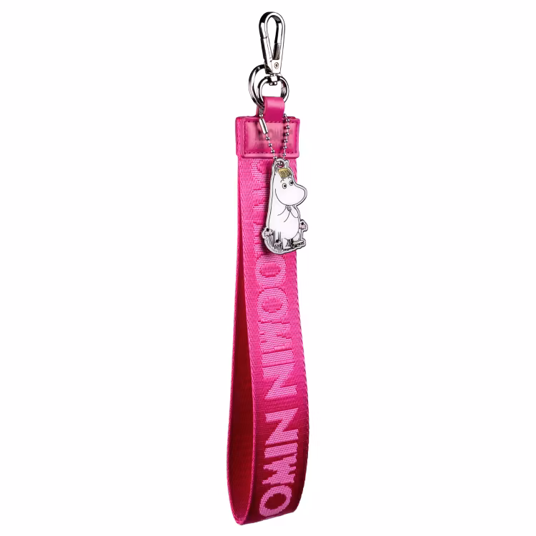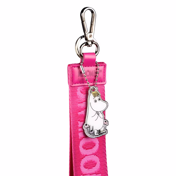 En rolig Mumin nyckelhållare och väskdekoration tillverkad i stadig, ceriserosa polyestercanvas, formad som en stor ögla. Storleken är 4 x 27 cm och den har ett Snorkfröken-hänge i metall, samt rund nyckelring och praktiskt clip-lås. Lätt att haka fast var du vill!