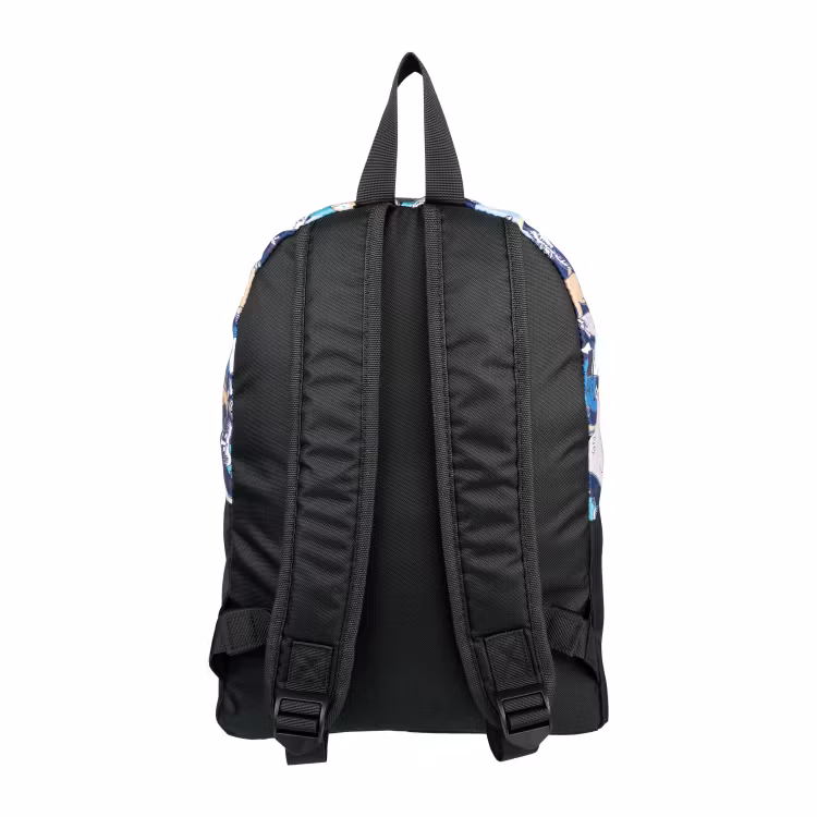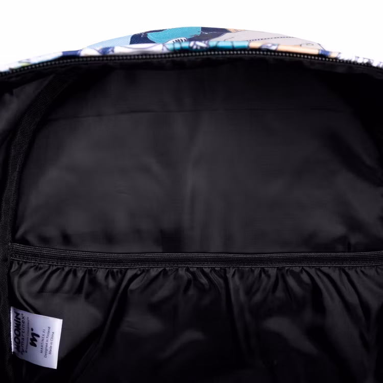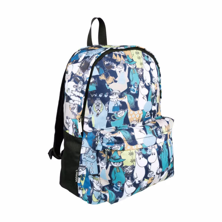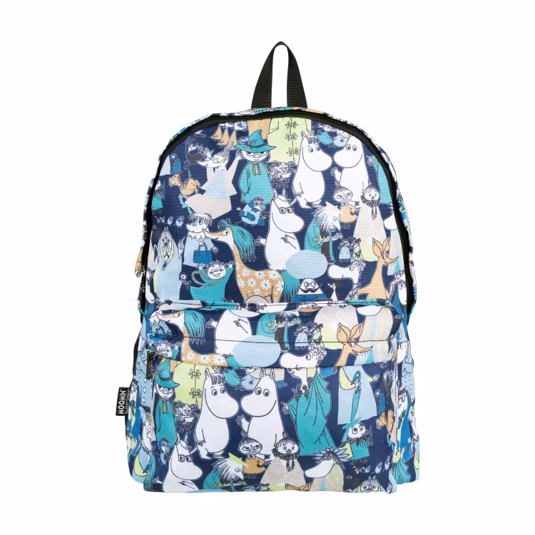 En Mumin ryggsäck i stadig polyestercanvas. Ryggsäcken har dubbla blixtlås och en blixtlåsförsedd ytterficka framtill. Den har vadderade och justerbara axelremmar, öppen innerficka och ett litet bärhandtag upptill. Volym ca 15 liter.