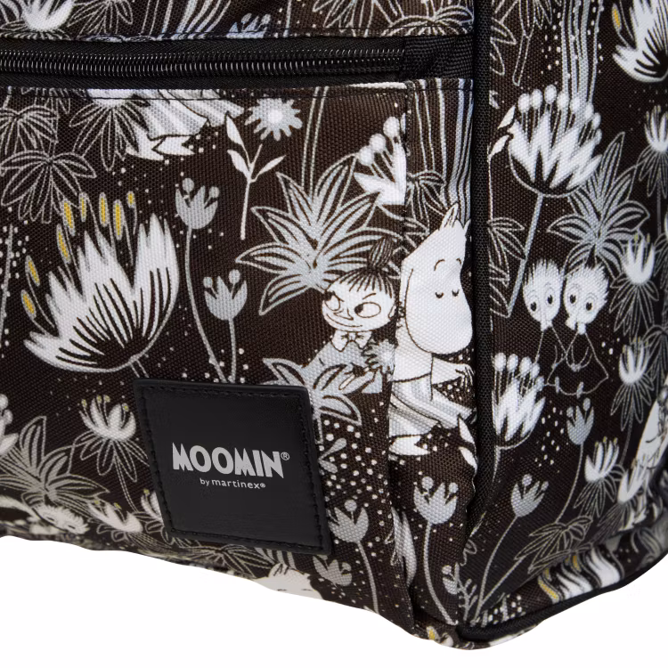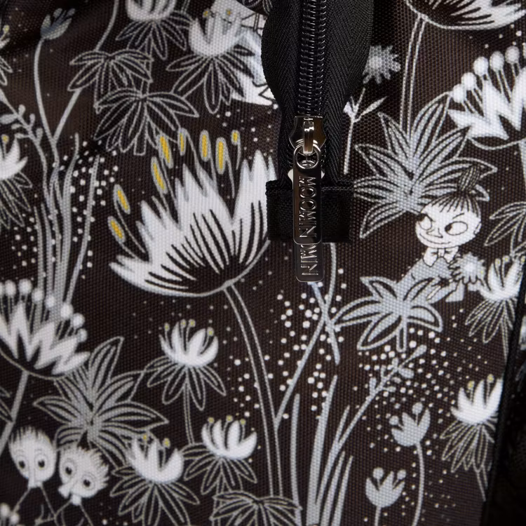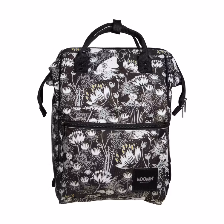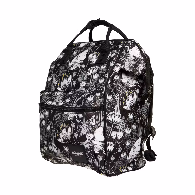 En rymlig Mumin ryggsäck i stadig polyestercanvas. Ryggsäcken öppnas stort upptill med dubbla blixtlås och inuti finns det en laptop-ficka mot den lätt stoppade ryggen. Blixtlåsförsedd ytterficka framtill och justerbara, vadderade axelremmar. Volym ca 15 liter.