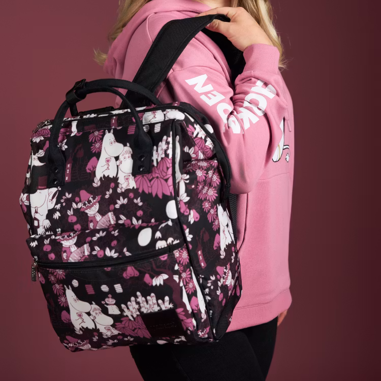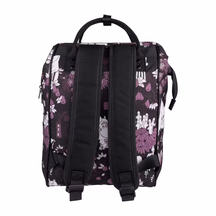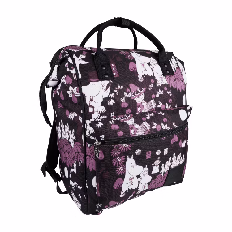 En rymlig Mumin ryggsäck i stadig polyestercanvas. Ryggsäcken öppnas stort upptill med dubbla blixtlås och inuti finns det en laptop-ficka mot den lätt stoppade ryggen. Blixtlåsförsedd ytterficka framtill och justerbara, vadderade axelremmar. Volym ca 15 liter.