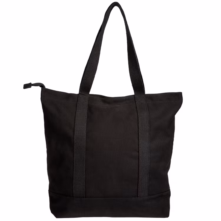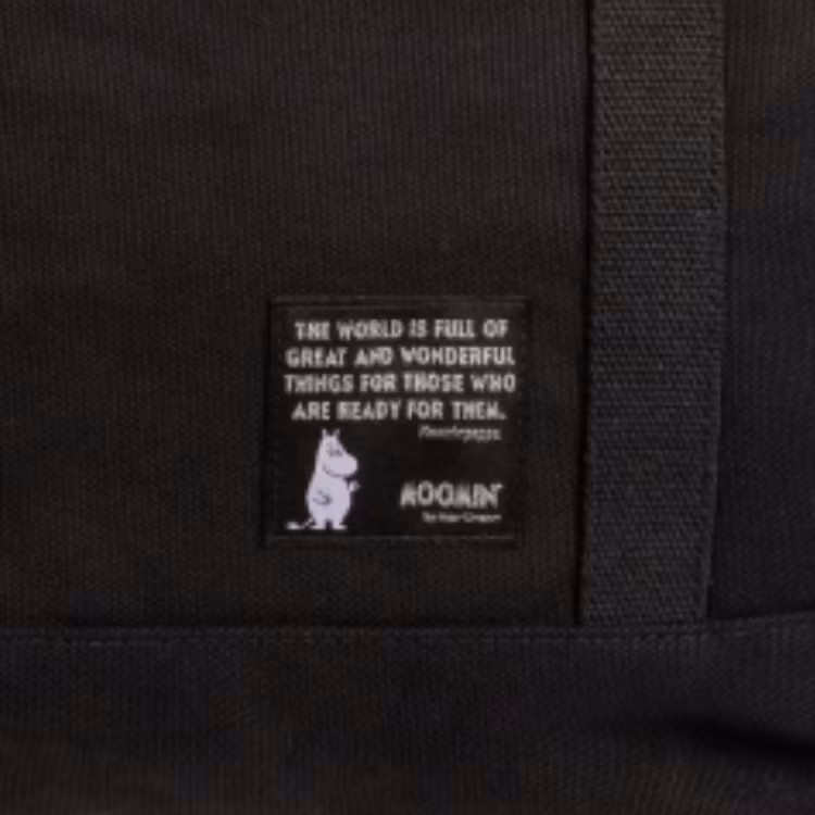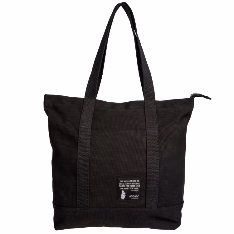 En svart väska i stadig bomullscanvas med stadiga handtag, som är cirka 26 cm höga. Väskan går att bära i handen eller över axeln. Upptill har den ett blixtlås, framtill en öppen ficka med en liten applikation av Muminpappan och det silverglittrande citatet ’The world is full of great and wonderful things for those who are ready for them’. Väskan är fodrad i svart, med en liten innerficka med blixtlås.